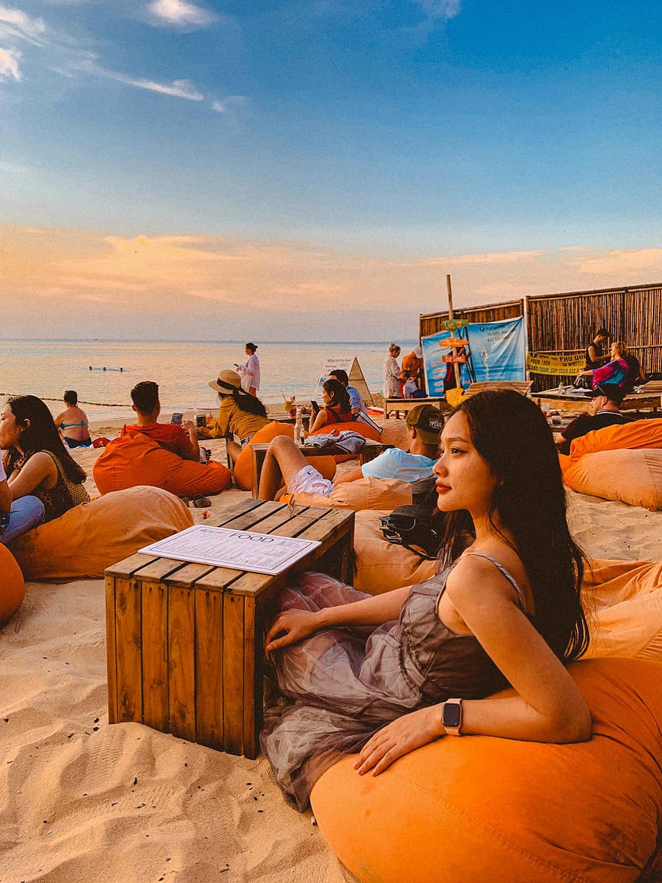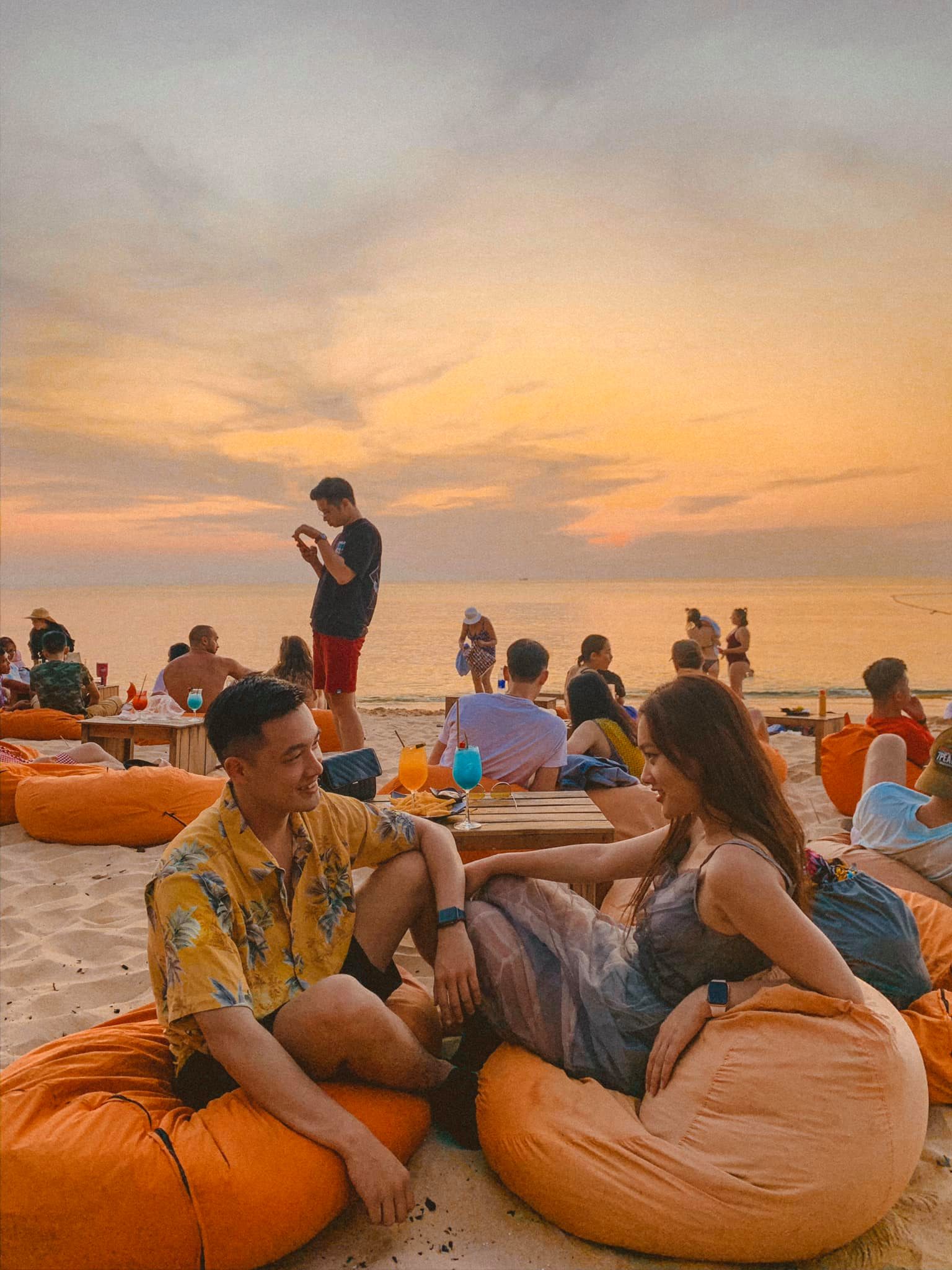 Ăn xong anh hướng dẫn viên cho lùi thời gian để cả đoàn nghỉ ngơi. Nghỉ ngơi xong bọn mình lên cano về lại Hòn Thơm chụp choẹt nốt trong vòng 30′ rồi lên cáp treo về lại đất liền. Trên đường về thị trấn bọn mình ghé ốc sen beach bar, ở đây chụp ảnh hoàng hôn chill chill rất hịn luôn nha.