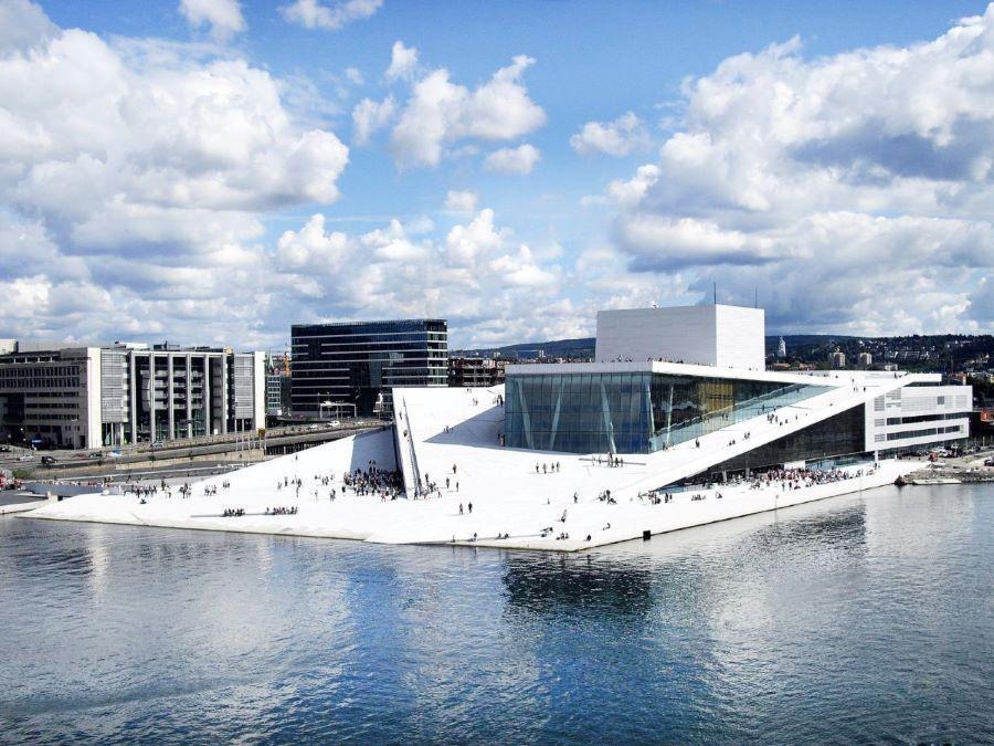 Nhà hát Opera Oslo: lóa mắt với “tảng băng trôi nhân tạo” hờ hững bên bờ biển. Một “tảng băng trôi” được tạo nên bởi những bàn tay vàng trông thật tự nhiên như chưa từng có sự sắp đặt nào cả.