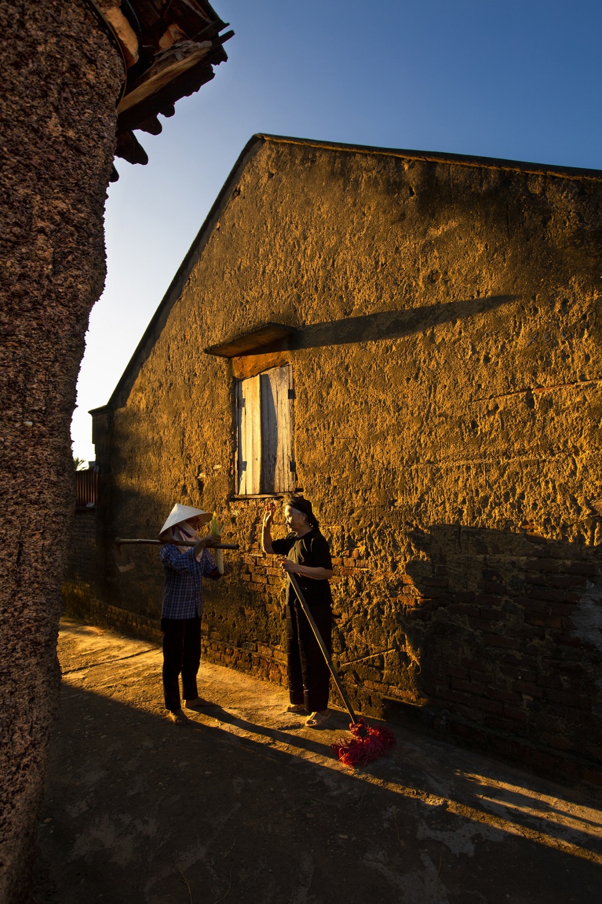 Cụ bà bên bức tường nhuốm màu thời gian, nở nụ cười, khoe hàm răng đen khi gặp ống kính. Phong tục nhuộm răng đen có từ xưa, ngày càng ít người giữ được truyền thống này.